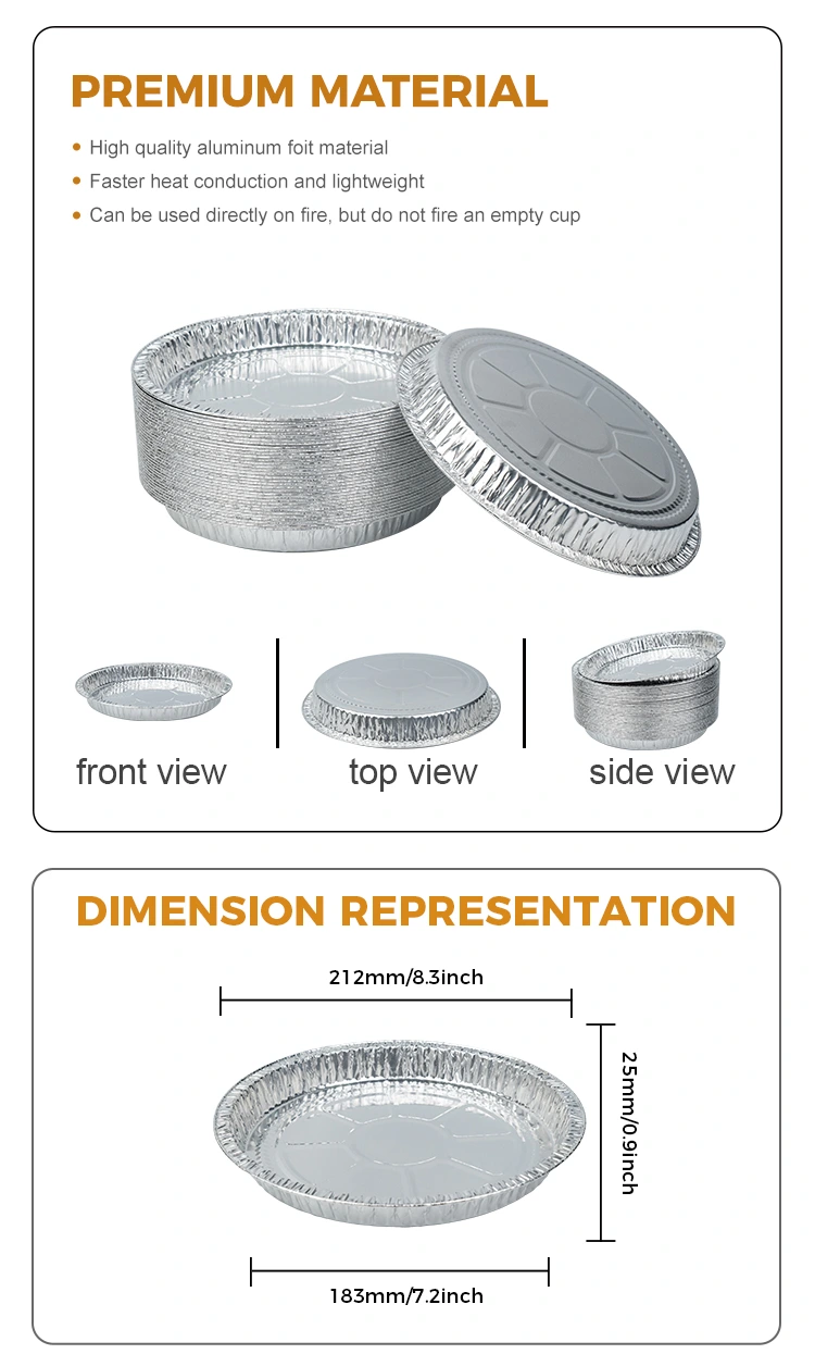 Yunchu alumínium fólia modell 1385 7-9 hüvelykes pizza serpenyő ezüst alumínium fóliafóli tartályok, felső átmérőjű 212 mm (8,3 hüvelyk), alsó átmérője 183 mm (7,2 hüvelyk), magasság 25 mm (0,9 hüvelyk). Körülbelül 680 ml (23,9 oz) kapacitással alkalmas pizzára és más pékáruk sütésére, sima felületű, tapadás nélküli, könnyű felszabadulással és szagokkal. Az emelt él kialakítása megakadályozza az összetevők kiszivárgását és javítja a sütés hatékonyságát. Ezenkívül a konténer logó testreszabási szolgáltatásokat nyújthat, amelyek segíthetnek az ügyfelek benyomásainak elmélyítésében és a márka imázsának javításában.