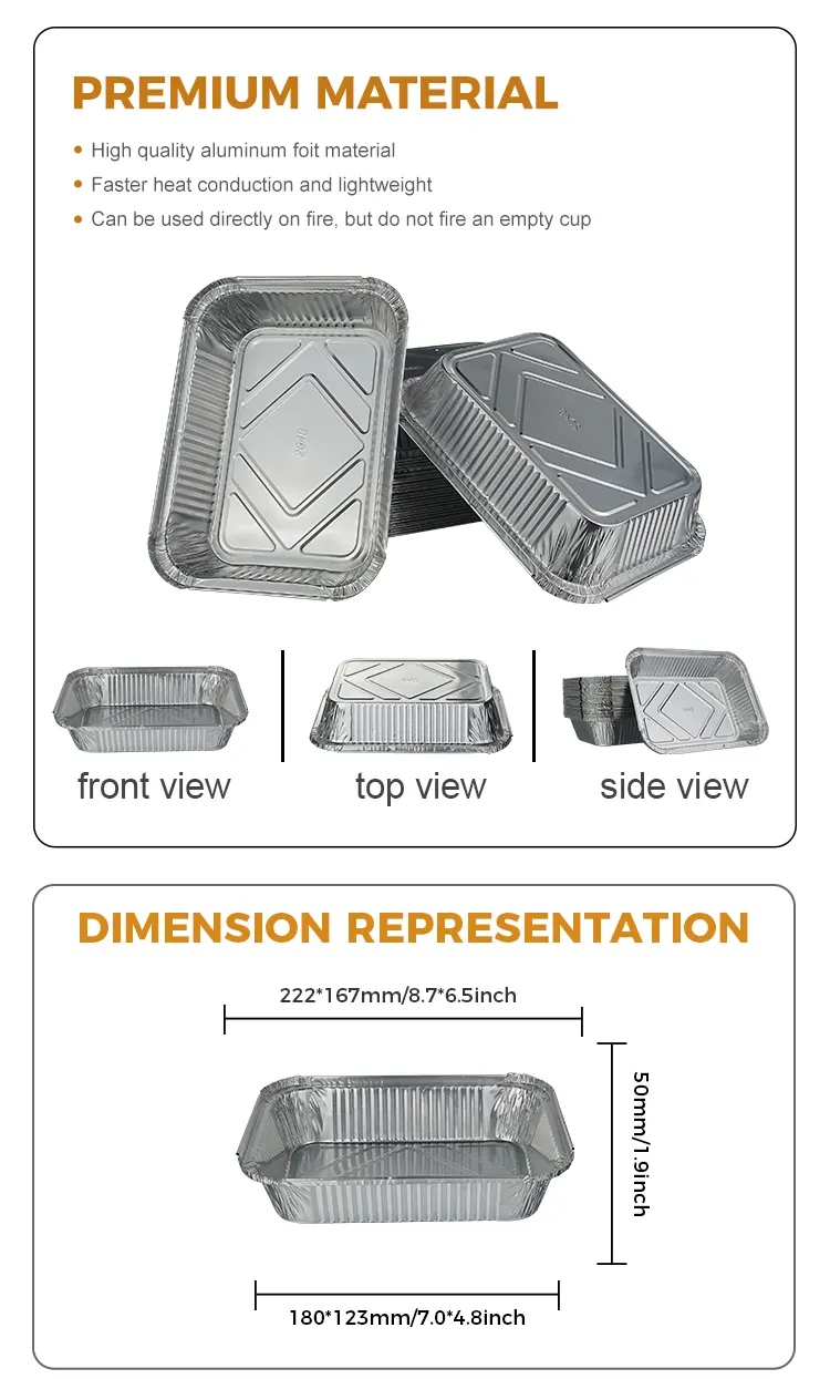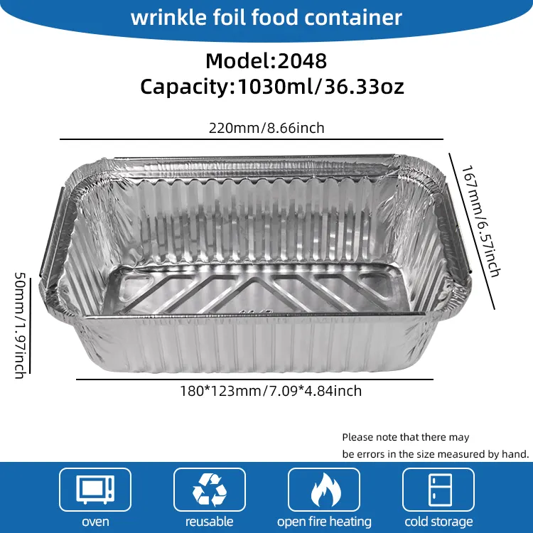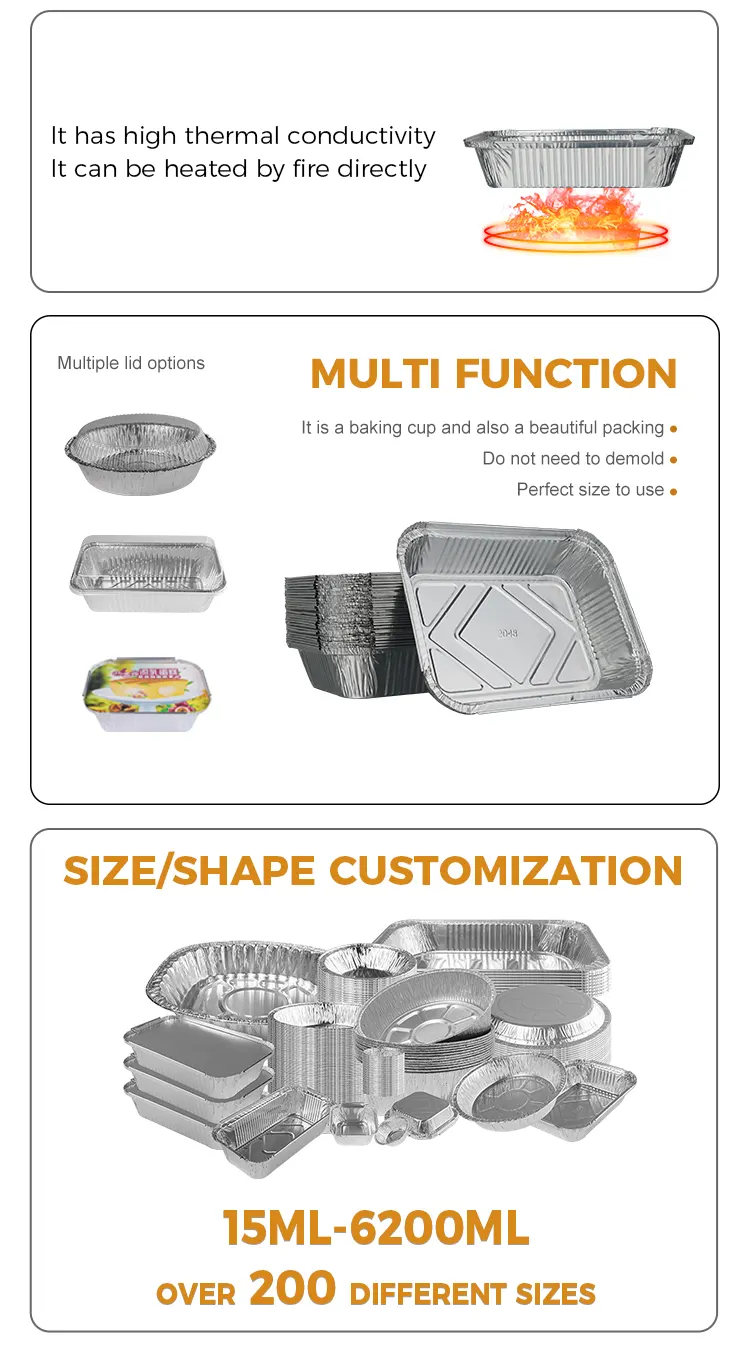 A Yunchu Aluminium Foil Factory eldobható grillsütő ebéddobozos ezüst alufólia tartálya nagy tisztaságú élelmiszer-minőségű alumíniumfóliából készült. Nem mérgező és íztelen, ellenáll a magas hőmérsékletnek és az alacsony hőmérsékletnek. Az olvadáspont eléri a 250 °C-ot. Élelmiszerrel közvetlenül érintkezhet. Magas hőmérsékleten hevítve nem bocsát ki káros anyagokat. Hűtve és fagyasztva is stabil alakot tarthat fenn. Egyszeri kialakítású, használat után kidobható. Nem kell időt tölteni a tányérok és tepsik tisztításával, teljesen méregtelenít Megoldja az étkezés utáni takarítás fárasztó problémáját, és különösen alkalmas olyan helyszínekre, mint például sok emberrel való összejövetel vagy szabadtéri utazás. A továbbfejlesztett vastagított alumíniumfólia anyag szilárd szerkezetű és erős tartóképességgel rendelkezik. Nem könnyű kifolyni vagy deformálódni, ha leveseket vagy nehéz grill-alapanyagokat tartalmazó ételeket tartunk. Az élek simák és sorjamentesek, így biztonságosabb a használata. Sütőbe, légsütőbe, párolóba és egyéb konyhai eszközökbe is alkalmas, a főzés és a tálalás egy lépésben elvégezhető.