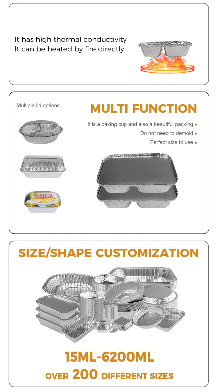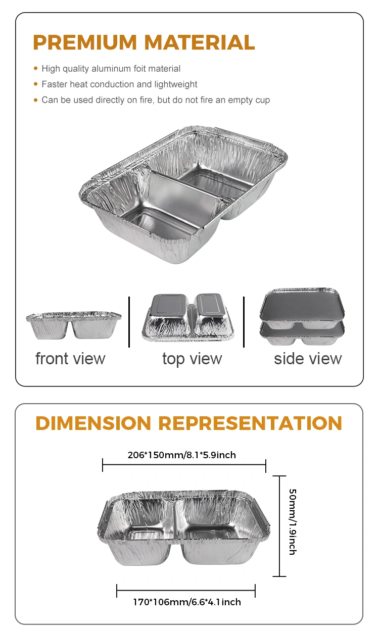 Az eldobható rekesz gyorséttermi, ezüst alumínium fóliafóli tartályok jó hővisszatartással rendelkeznek, és lelassíthatják az élelmiszer -hőveszteséget. Ősszel és télen jó hatással van a forró ételek megőrzésére, például a frissen készített forró pörkölt, amely egy bizonyos ideig fenntarthatja az étkezés hőmérsékletét, hogy a fogyasztók étkezés közben élvezhessék a forró ételeket.