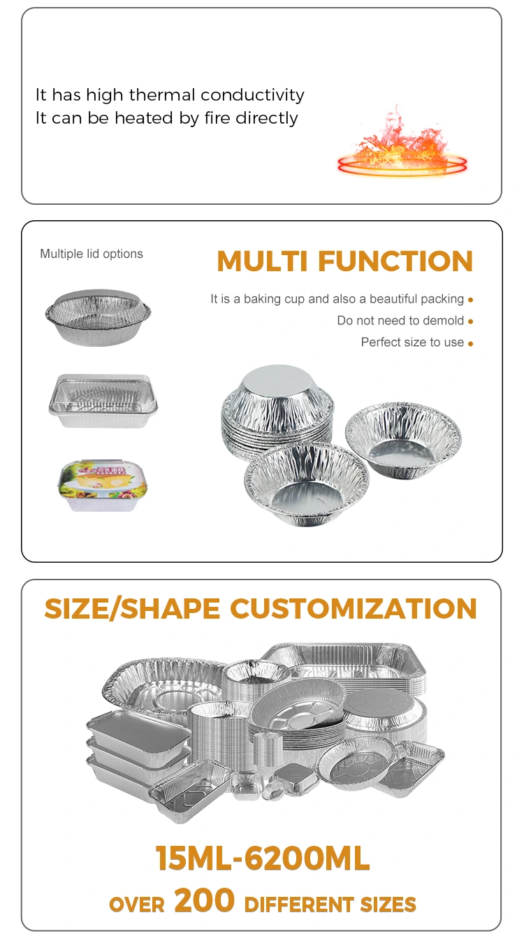 A Foshan Yunchu Alumíniumfólia Technology Co., Ltd. eldobható tojástorta tálcás ezüst alumíniumfólia-tartálya fejlett automatizált gyártósorokon és szigorú minőség-ellenőrzésen alapul, a Yunchu alumíniumfóliás eldobható, ezüst alumíniumfólia-tartály, élelmiszer-minőségű anyagokkal és kiváló teljesítménnyel, így több háztartási és ipari sütést is gondtalanabbá tesz.