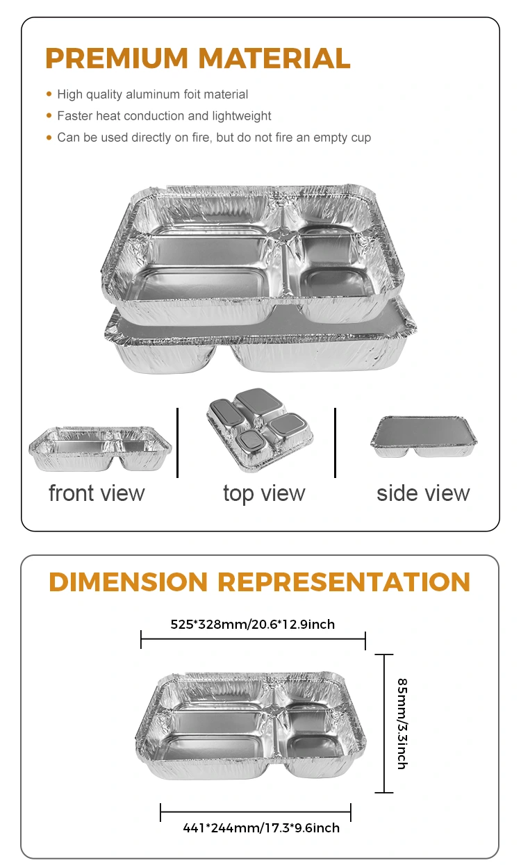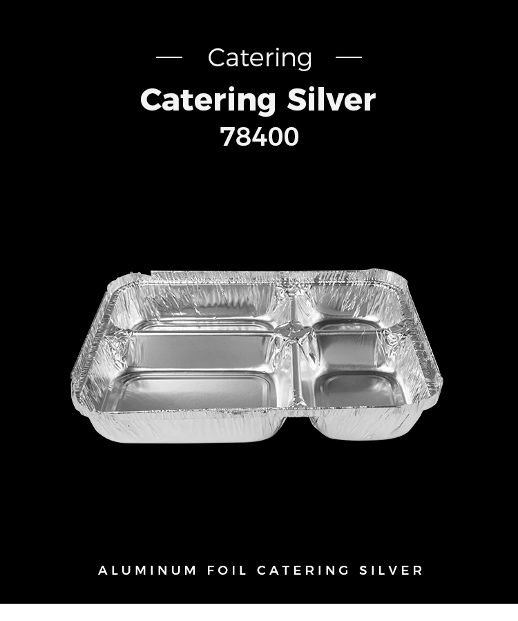 A Yunchu alumínium fólia-ellátó gyár új eldobható, többrétegű gyorséttermi ezüst alumínium fólia-tartályokat indított. in). Körülbelül 1020 ml (36,0 oz) kapacitással kényelmes és praktikus, hogy különféle ételeket tartson négy rekeszben.
