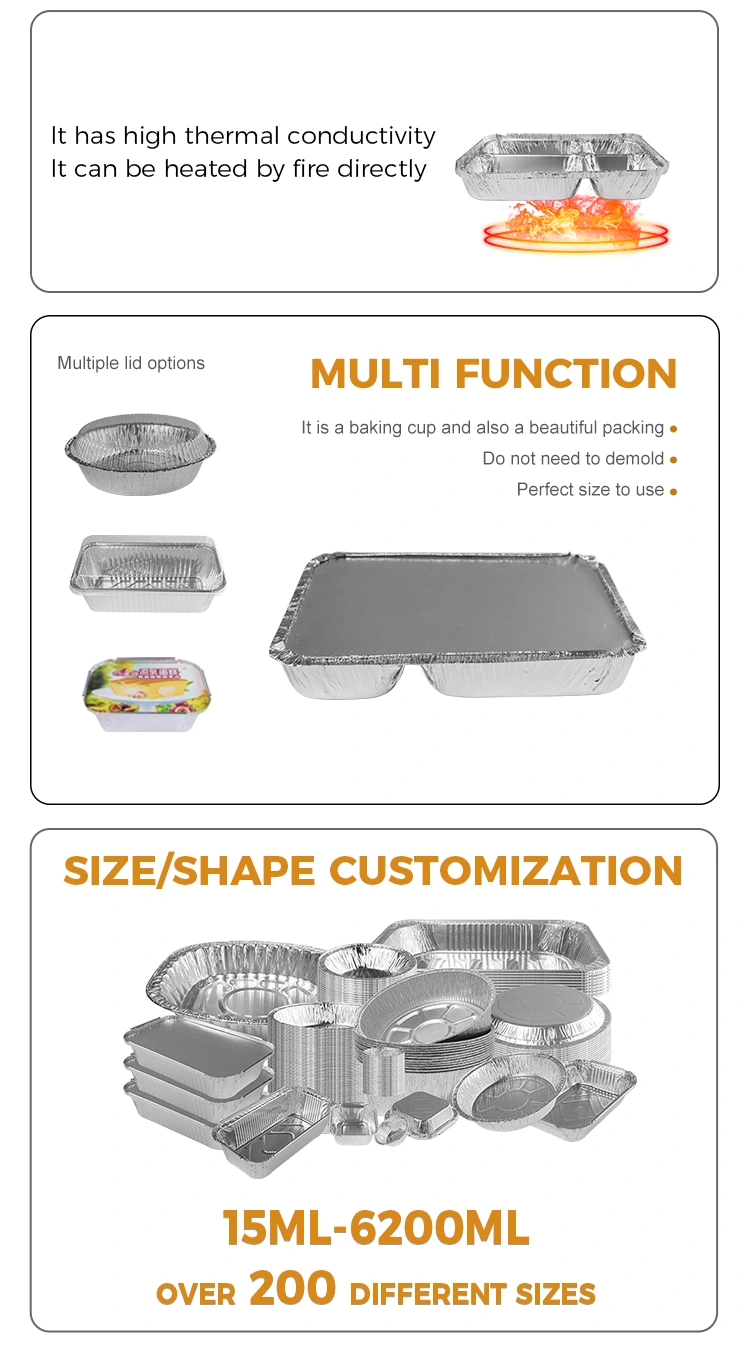 Ez az alumínium fólia ebéddoboz nemcsak termikus szigetelő tulajdonságokkal rendelkezik, hanem párosítható egy alumínium fólia fedéllel is, tovább javítva a termék praktikusságát. Ezenkívül testreszabott logóközvetítést is nyújtunk a márka imázsának javítása és az ügyfelek memóriapontjainak javítása érdekében.