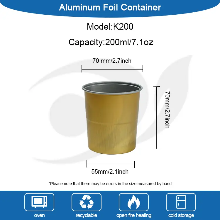 A Yunchu alumínium fólia -ellátó gyár által szállított K200 eldobható hordozható kávéfogyasztási csésze felső átmérője 70 mm (kb. 2,7 hüvelyk), alacsonyabb átmérője 55 mm (kb. 2,1 hüvelyk), és 70 mm (kb. 2,7 hüvelyk). A kapacitás körülbelül 200 ml (kb. 4,2 oz). Ez az eldobható kemping kávéfogyasztási csésze különféle alkalmakra alkalmas, például üzleti tevékenységekre, kempingre, családi összejövetelekre stb., Amely praktikus és gyönyörű, alkalmas az Ön számára, akik magas életminőséget folytatnak. A csészét vastagabb bevonattal tervezték, hogy egyenletesen eloszlatja a hő és elkerülje a kézégéseket.