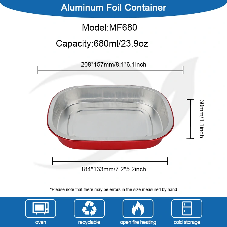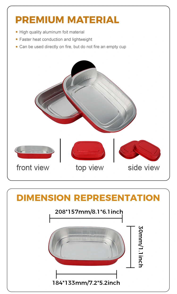 A Yunchu az alumíniumfólia tartályok professzionális gyártója és szállítója Kínában. Az általunk kínált, eldobható piros ebéddobozos négyzet alakú alumíniumfólia tartályok átmérője 208 * 157 mm (8,1 * 6,1 hüvelyk). Alsó átmérője 184*133 (7,2*5,2 hüvelyk), magassága 30 (1,1 hüvelyk), űrtartalma megközelítőleg 680 milliliter (23,9OZ). Élelmiszer-minőségű 8011 élelmiszer-minőségű alumíniumfóliával sűrített alapanyagot használ, amely figyelembe veszi a szívósságot és a teherbíró képességet is, nem könnyen deformálódik vagy szivárog, és közvetlenül megtámasztja az élelmiszereket. Kompatibilis a -20 ℃ és 220 ℃ közötti rendkívül széles hőmérsékleti tartományban. Lebontásra nincs szükség. Közvetlenül a sütőbe, légsütőbe vagy gőzölőbe tehető felhasználás céljából, és tartósítás céljából hűthető is. Egyablakos kényelmes élményt kínál a "sütés - tárolás - fogyasztás - ártalmatlanítás" terén. Az alumíniumfólia fő előnye a magas hővezető képesség. Az aranyszínű bevonat elősegíti a hőgyűjtést, biztosítva az étel egyenletes és gyors felmelegedését.