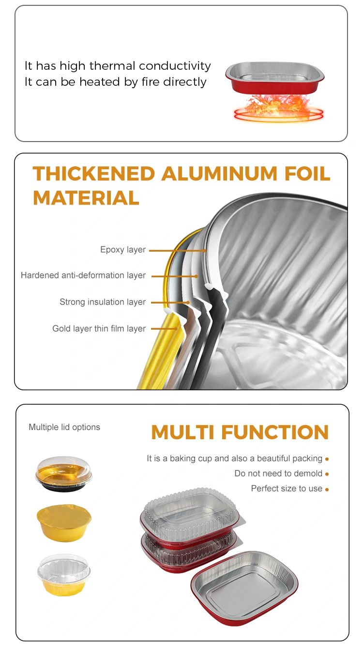 Legyen szó kezdő pékről, aki kekszeket és tojástortákat süt, vagy haladó játékos, aki tésztát és egész halat süt, az eldobható, négyzet alakú, piros ebédlődobozos alumíniumfóliás edények tökéletesen adaptálhatók. Nem kell előre olajozni. A hozzávalókat közvetlenül a sütésbe lehet tenni. A sütőből kivéve közvetlenül a tányéron tálalhatók, így elkerülhető a tepsi formázása és tisztítása. Az aranyszínű megjelenés még finomabbá teszi a pékárut. A fesztivál ideje alatt egy arany tepsi áfonyás sütiből és sült csirke sütése azonnal betölti a viszontlátás hangulatát. A fénykép készítése és a közösségi média platformokon való megosztása nagyon figyelemfelkeltő lesz.