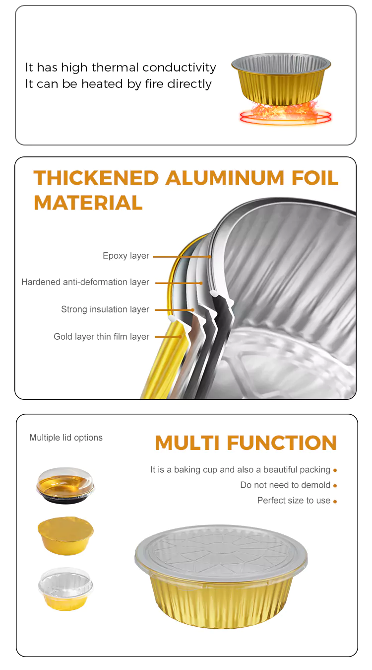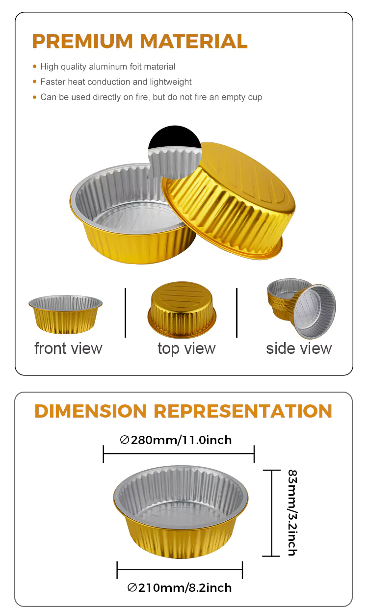 A Yunchu alumíniumfólia kiváló minőségű eldobható, kerek, nagy kapacitású arany alumíniumfólia tartályokat szállít Önnek. Tetszetős megjelenésű dizájnt alkalmaztunk, amely egyszerre magas megjelenési szintet és praktikusságot tesz lehetővé. Az alkalmazási forgatókönyvek közé tartoznak az otthoni konyhák, vendéglátó-ipari vállalkozások, sütőstúdiók stb.