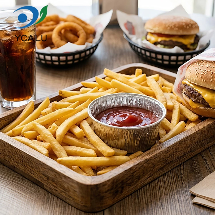 Yunchu alumíniumfólia beszállító eldobható kerek szósz légsütő ezüst alumínium fólia tartály élelmiszer minőségű alumínium fólia anyag, nincs szag, nincs nehézfém maradvány, megfelel az élelmiszerekkel való érintkezési szabványoknak, nagy tisztaságú és stabil kémiai tulajdonságokkal rendelkezik. Még ha savanyú szósszal töltik meg és magas hőmérsékleten hevítik, akkor sem bocsátanak ki káros anyagokat, és teljesen biztonságban érezheti magát, ha közvetlenül érintkezik élelmiszerrel. A termék átesett az FDA élelmiszer-minőségi tanúsítványán, és szigorúan követi az FDA 21 CFR-hez kapcsolódó szabványokat, a professzionális migrációs tesztelést és a nehézfém-detektálást követően a káros anyagok, például az ólom és a kadmium tartalma messze a biztonsági küszöb alatt van, és a minősítések teljesek. Legyen szó otthoni vagy kereskedelmi használatra, nyugodt szívvel választhat. Használja húsok pácolásához szószok, zöldségekhez salátaöntetek, gombócok mártogatásához ecetes ételek adagolására. Az adagok pont megfelelőek, pazarlás nélkül. A szagátadást is elkerülheti, és a hűtőszekrényben is szépen tárolható anélkül, hogy helyet foglalna. Az elvihető kereskedők a mártások tárolására használják, amelyek zárt és szivárgásmentesek, és tisztán szállítják a vásárlókhoz. Legyen szó ketchupról, édes chili szószról vagy sűrű szezámmártásról, nem okoz zavart a kiszivárgás és az étel szennyeződése. Akár szabadtéri piknikekhez és kempingezéshez is vihetsz magaddal néhányat, és mártogatós szószokat tarthatsz vele. Könnyű és nem foglal helyet. Használat után azonnal kidobhatod. Nem kell egy csomó koszos konténert hazavinned. Főleg az egyszerűségről és problémamentességről szól.