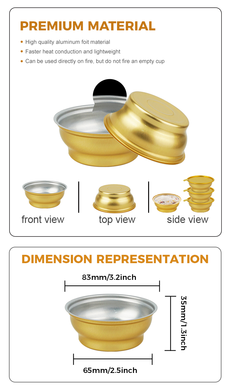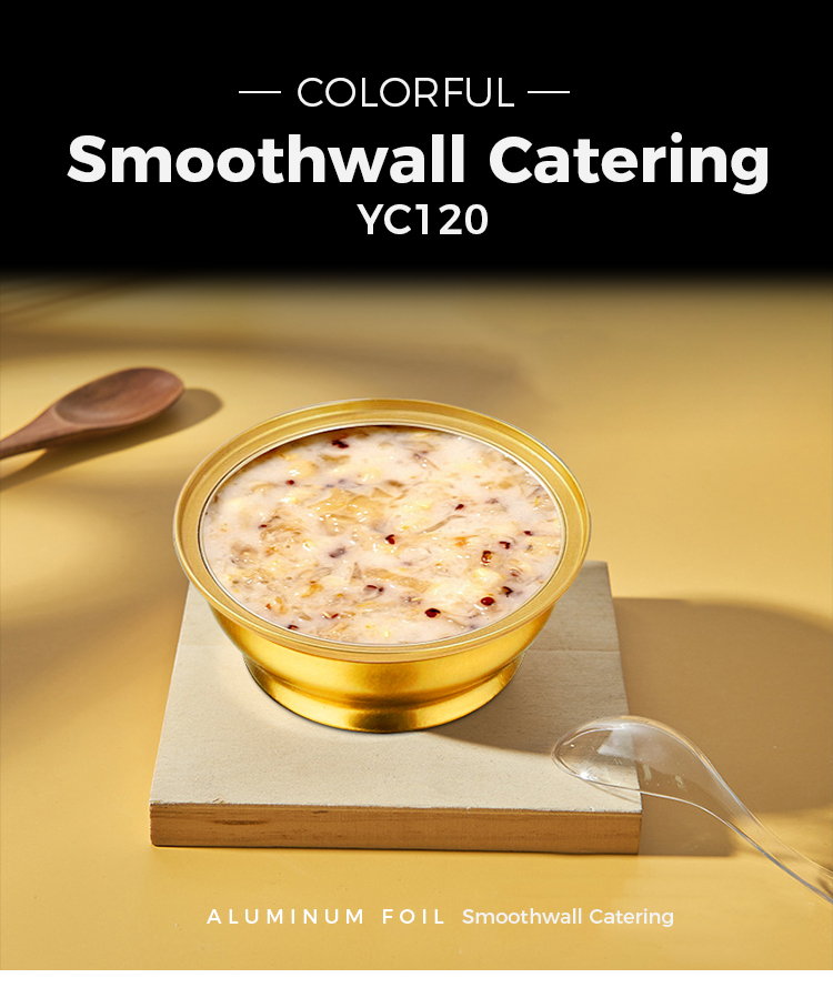 Yunchu alumínium fólia -gyártó eldobható kerek elvihető doboz kis arany tál alumínium fólia -tartályok Az YC120 felső átmérője 83 mm (3,2 hüvelyk), alsó átmérője 65 mm (2,5 hüvelyk), magassága 35 mm (1,3 hüvelyk), és körülbelül 120 ml (4,2 oz). Támogatja a testreszabást, például a színt, a vastagságot és a dombornyomott logót.