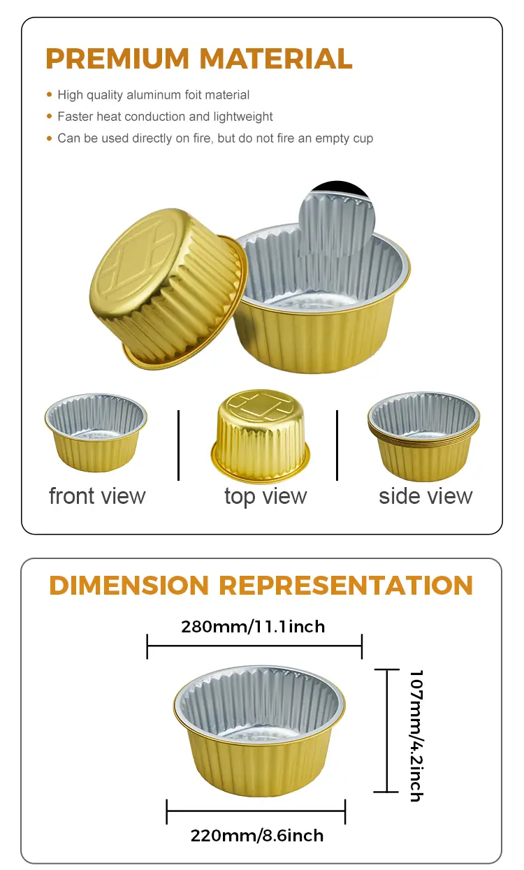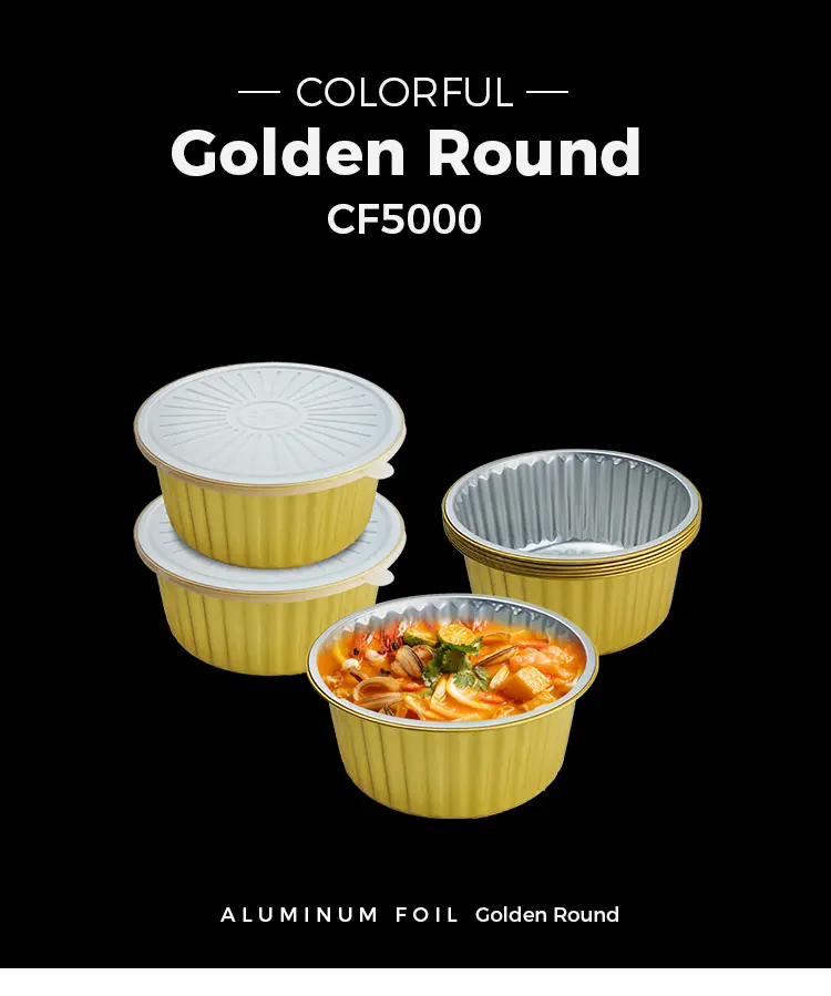 Yunchu alumínium fólia Az eldobható lezárható arany kerek alumínium fólia-tartályok A CF5000 Modell A nagykereskedelem széles választékával rendelkezik, felhasználhatja a fedett alumínium fólia hőhőzési fedelét a sütéshez, a tároláshoz, a szállításhoz és a szállításhoz, mindenféle összeszerelő ételt stb. Ünnepi partik, vendéglátóipari tevékenységek, önkiszolgáló vendéglátóüzletek stb., Eldobható, pezsgő arany kerek alumínium fóliafóli tartályok, amelyek kiváló minőségű 8011-0 alumínium fóliából készülnek, a fedéllel eldobható, eldobható sütőtálca tartós, nem könnyen lyukasztható vagy sérült; Az anyag lehetővé teszi a hő egyenletes eloszlását, a jó hővisszatartást, a ragasztás nélkül, nincs égető, vízálló és olajbiztos, nem kell tisztítani, nincs szükség az olajfoltok terhére. A sima szélek nem bántják a kezét, biztosítva, hogy az előre elkészített ételek teljesen főzzenek; A fólia serpenyő elegáns arany színű, amely javítja a bemutatót, és kiegészíti a konyhát vagy az esemény dekorációját.
