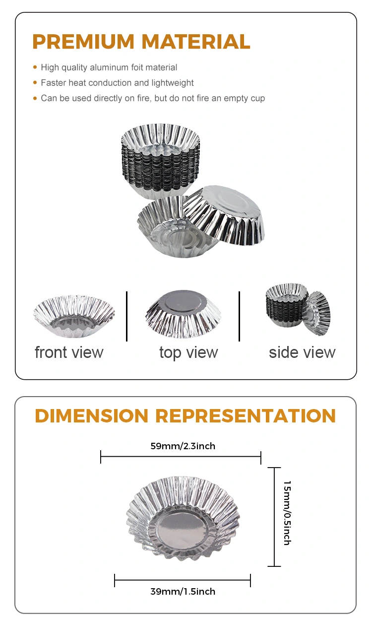 A csúszás nélküli alumínium fólia-tartály-csésze testtest csúszásgátló textúrával tervezték, növeljék a súrlódást, megakadályozzák a csúszást, a göndör csésze száj kialakítását, könnyen elkészíthető, nem fog kezet ártani, többszörös nagy kapacitású kialakítás, nem kell megtakarítani, idő- és energiát megmenteni, széles körben használni a sült tojássüteményekhez, a süteményekhez, az euzsák-ciszpusokhoz és a tál süteményekhez és az egyéb delicaciókhoz, a környezetbarát anyagokhoz használják a tojástestekhez Tanúsítás és ISO9001 Minőségirányítási rendszer tanúsítása, biztosítsa a termék biztonságát és környezetbarátságát.