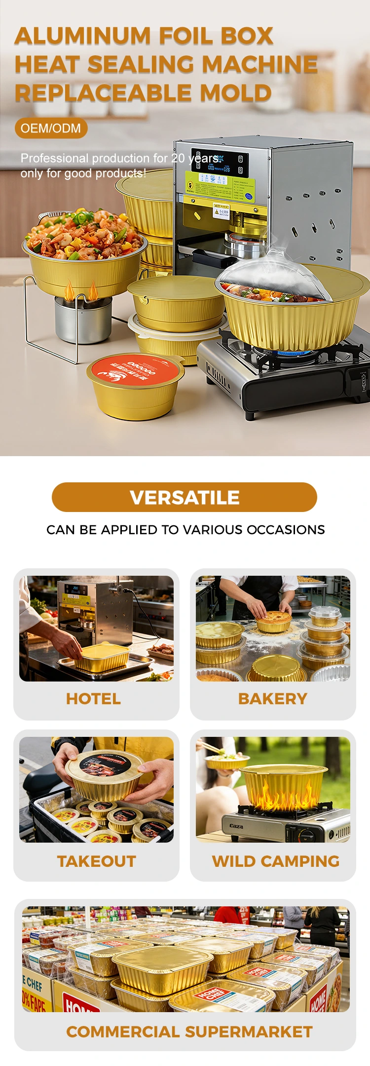 Átfogóbb forgatókönyvek: Vendéglátóipar: csúcskategóriás elvitel, bankett-adagolás, előre elkészített élelmiszer-csomagolás, a minőség és a praktikum ötvözésével; Élelmiszervállalkozás: Kis snack műhelyek, szósz feldolgozás, friss élelmiszer e-kereskedelem, professzionális csomagolás elérése alacsony költséggel; Fesztivál ajándékok: Karácsonyi, Tavaszi Fesztivál, Közép-Őszi Fesztivál és egyéb fesztivál élelmiszer-ajándékdobozok. Az aranyszínű megjelenés fokozza az ünnepi hangulatot, a zárt kivitel pedig biztosítja az ajándékok frissességét.