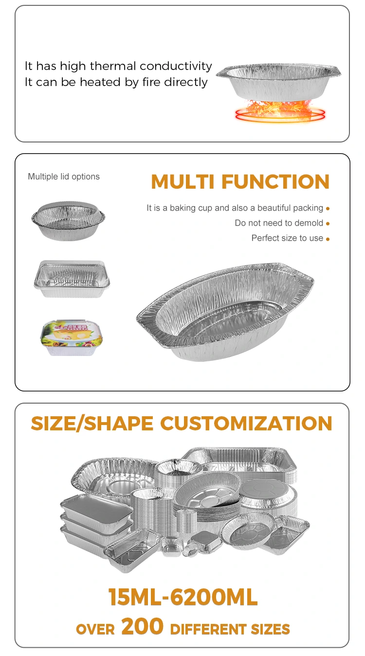 Ennek a tartálynak nagy kapacitása van, és alkalmas a mindennapi ételek és snackek tárolására. Eldobható elemként nem kell mosni, ami nagymértékben megtakarítja a munkaerőköltségeket. A terméket alumínium fólia-háziállat-borítóval és egy alumínium fólia-hő-tömítőfóliával van felszerelve, hogy ne legyen olajszivárgás, vízszivárgás, magas hőmérsékletű ellenállás és nem könnyű deformálódni, javítani az élelmiszerek frissességét és hőmegőrzését, és jobbá teszi a szállítási hatást. Ugyanakkor a termék megfelel az ISO9001 és az SGS Food Contact szabványoknak, biztonságos és megbízhatóvá téve.
