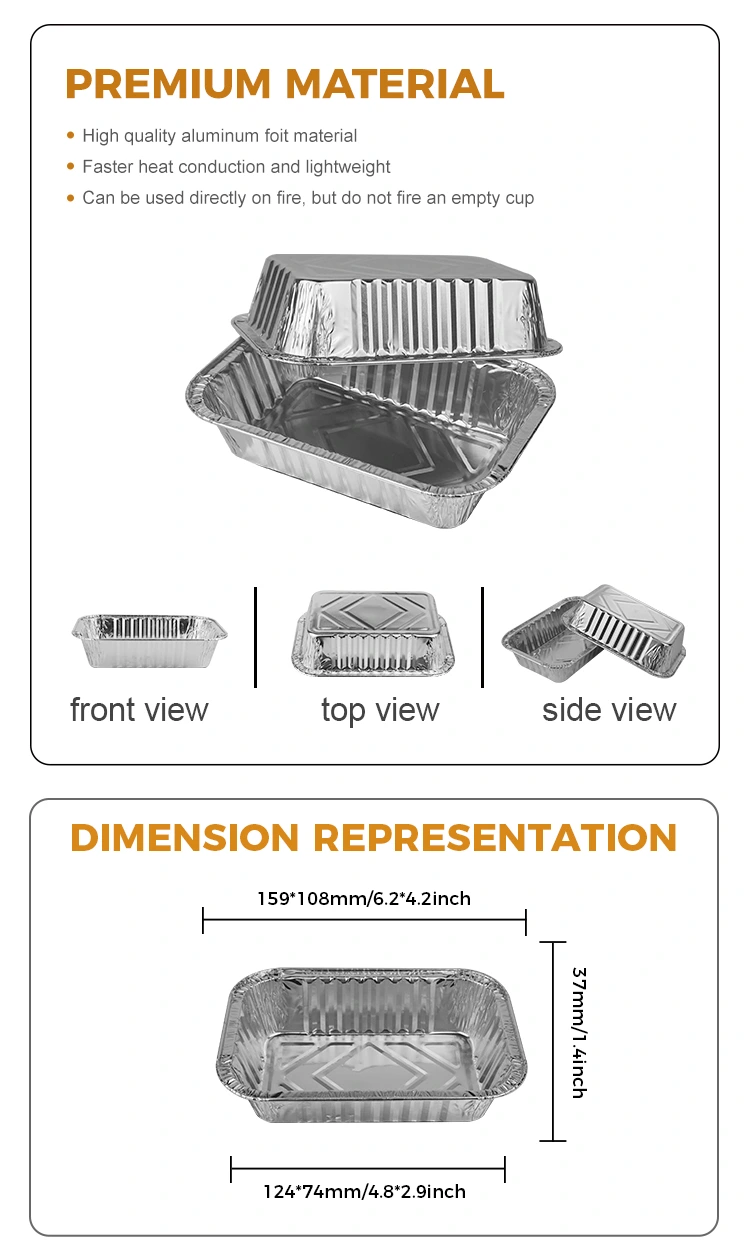 A Yunchu alumínium fólia-szállítóból származó 2322-es téglalap alakú serpenyő ezüst fóliatartót élelmiszer-minőségű alumínium fólia anyaggal gyártják, biztosítva az élelmiszer biztonságát és szagmentes természetét. A termék tiszta és újrahasznosítható, és több nyugalmat ad neked. Méretei 159 mm (6,2 hüvelyk) és 108 mm (4,2 hüvelyk) felső átmérőjűek, 124 mm (4,8 hüvelyk) és 74 mm (2,9 hüvelyk) alacsonyabb átmérőjűek, 37 mm (1,4 hüvelyk) magas és kb. 400 ml (14,1 oz) kapacitással. Az alumínium fólia dobozok kiváló hőmegőrzési funkciókkal rendelkeznek, különös tekintettel a hőmérséklet -szabályozásra az elvihető és bevásárlóközpont ételeiben, akár kis sütemények, akár gyümölcsanyagok.