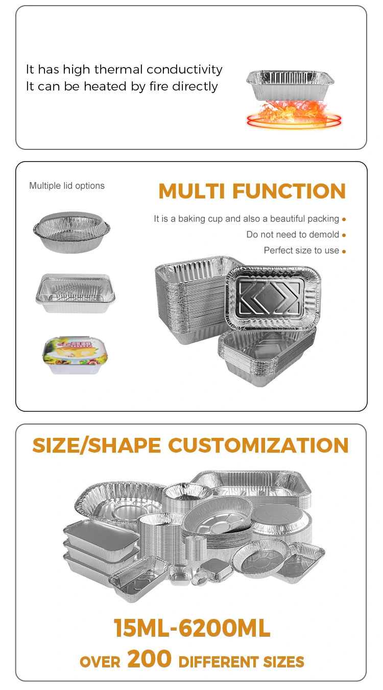 A Yunchu alumínium fólia beszállítója 2322 -es téglalap alakú sütőedény ezüst alumínium fóliafóliótartály nagyon népszerű a piacon, kiváló termékminősége és egyedi kialakítása miatt. A termékszerkezet rugalmas a különféle forgatókönyvek igényeinek kielégítésére, és testreszabott szolgáltatásokat nyújt, beleértve a logót és a mintamintát, amely elősegíti a márka imázsának javítását. Ezenkívül az alumínium fólia fedezetének nagykereskedelmi megrendelési szolgáltatása szintén nagyon kedvelt, egyetlen testreszabott MOQ -val 1000 darab.