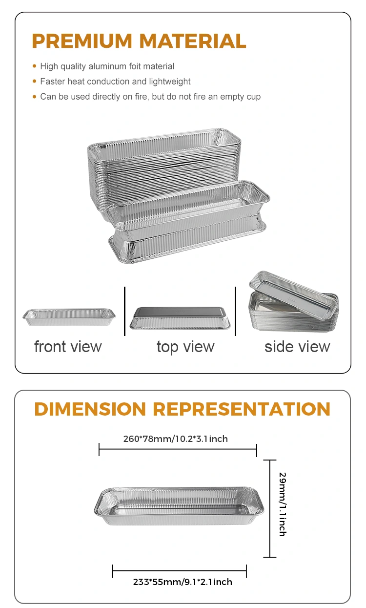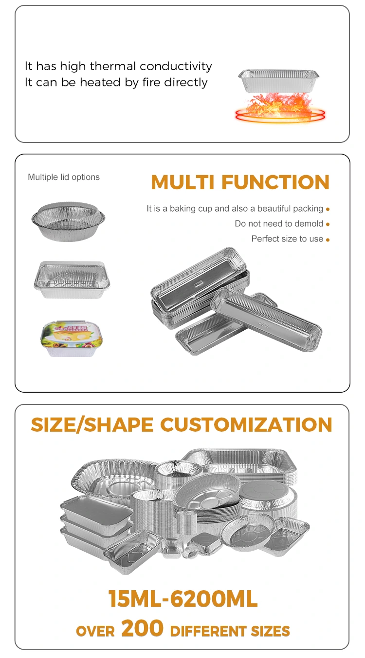 Jellemzők: Az ebéddoboz nagykereskedelme 8011 alumínium fólia anyagból készül, amelynek jó hőmegőrzési hatása van, és fenntarthatja az étel hőmérsékletét, így az ételek finomabbá és ízletesebbé válik. Ezenkívül a téglalap alakú BBQ ezüst alumíniumfólia -tartályunk hőszigetelő funkcióval is rendelkezik, és alumínium fólia fedéllel és PET műanyag fedéllel illeszthető.
