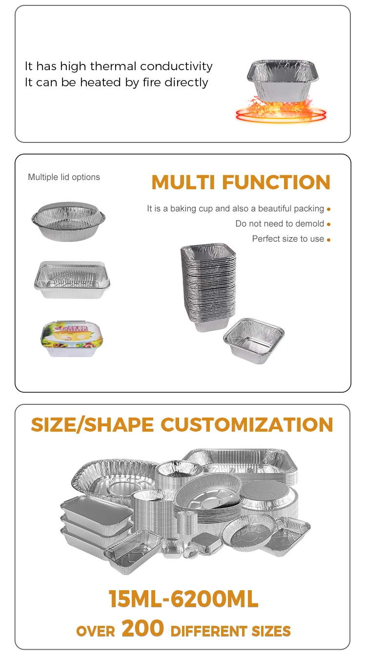 A négyzet alakú levegő sütő ezüst alumínium fólia-tartály kiváló minőségű alumínium fólia anyagot használ, amely könnyű és tartós. A tetejét testreszabható egy kedvtelésből tartott átlátszó fedéllel, és az alsó fedélnek van egy fedele, amelyet a dobozba szorítanak és rögzítenek, hogy megakadályozzák az ételek ragaszkodását a sütőlaphoz, amely könnyen felszabadítható, tisztítható, és könnyen szállítható és használható.