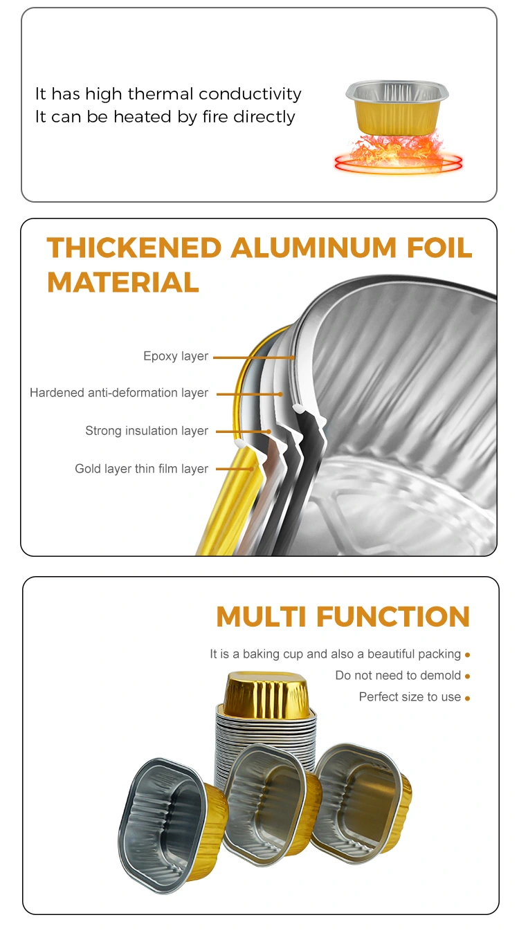 Yunchu alumíniumfólia gyártó szögletes desszertes sütőpoharak A Smoothwall alumíniumfóliás edények légsütőkben, sütőben, szószokban stb. használhatók. Ezek a sütőpoharak speciálisan megerősített bordás kialakítással rendelkeznek, és a rövid csészetest szerkezetük miatt jó súrlódási tulajdonságokkal rendelkeznek, nem könnyű elcsúszni, könnyen fogható és nem fáj a szájuk. Különféle desszertek készítésére alkalmasak, beleértve a süteményt, pudingot, omlós tésztát, pitéket, fahéjas tekercseket, sajttortákat, pudingokat és pudingokat. Ez a bordás szerkezet extra tartást biztosít, és különösen alkalmas kereskedelmi pékségekben vagy nagy szupermarketekben való használatra.